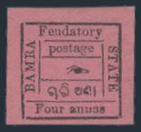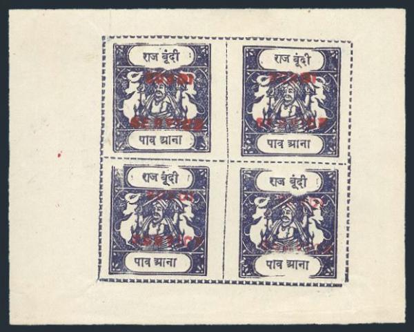 2666 O33a imageO33a, Rouletted sheet of 4 ¼ Anna cobalt with red overprint. F-VF, crease in selvedge not affecting stamps. Scarce (Image) Cat 2,100.00