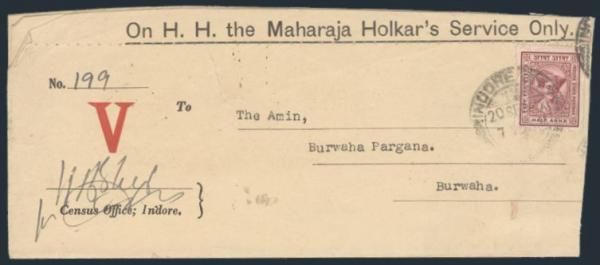 2672 16 image16, Tied by Indore 19 Sept 1942 on WWII Official Patriotic folded notice to Barwaha (21 Sept b/s). Has red "V" for Victory imprint. F, slightly reduced & edge tear. Attractive & scarce (Image) Estimate 50.00+ $Cdn