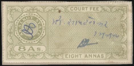 2653   imageAKALKOT STATE: Lot of 4 Court Fee Revenues Koeppel and Manners #'s 43-5, 45a. Each on piece, from 1942-9. VF, couple minor flaws. Cat $475 US (4) (Image) Estimate 85.00+ $Cdn