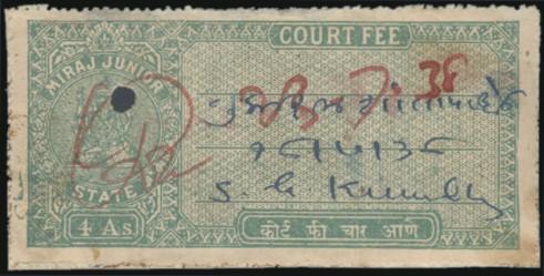 2654   imageMIRAJ JUNIOR STATE: Three diff green Court Fee Revenues, 4 Annas and 8 Annas, from 1936-44. F-VF (Koeppel & Manners #'s 74-5, 104, Cat $250 US) (Image) Estimate 60.00+ $Cdn