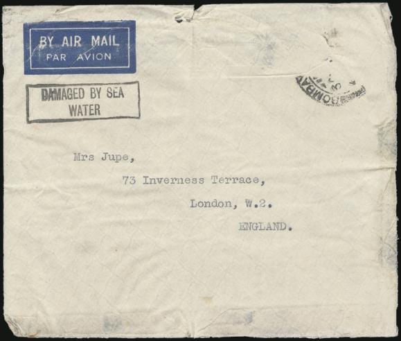 2657   imageAirmail cover with partial Bombay 30 Nov 1937 CDS to London. Retrieved from crashed Imperial Airways flying boat CYGNUS which crashed at Brindisi 4 Dec 1937. Has black boxed "DAMAGED BY SEA/WATER" h/s and British Post Office "FOUND OPENED OR DAMAGED" seal on back. F, water damaged, stamps floated off. Write up accompanies (Image) Estimate 125.00+ $Cdn