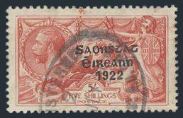 2718 78b image78b, Five Shilling Seahorse with FLAT ACCENT variety, nicely centered, VF (SG #87c, Cat £900) (Image) Estimate 500.00+ $Cdn