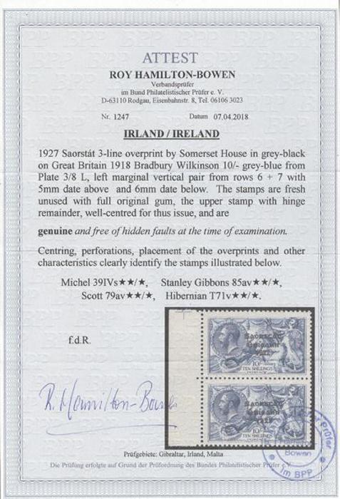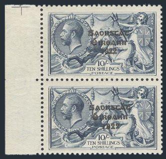 2719 79a image79a, Ten Shilling Seahorse sheet margin vertical pair showing WIDE AND NARROW "1922". Beautifully centered, pristine fresh colour, VF, bottom stamp is NH. Has 2018 Hamilton-Bowen Certificate (Image) (View Certificate)