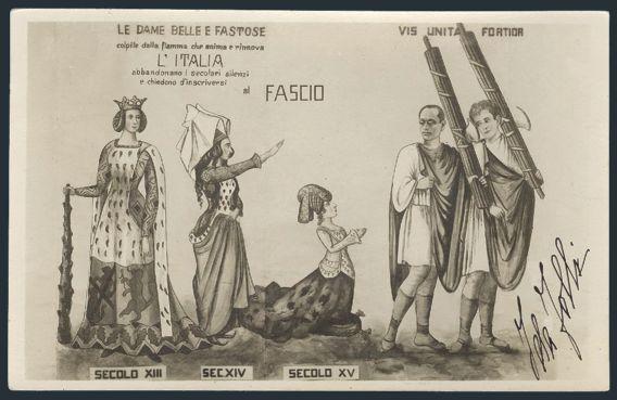 by Bologna 5 Apr 1932 cancel on illustrated Patriotic postcard to Cogoleto. Depicts 3 Royal Medieval Ladies imploring 2 men bearing Fasci bundles. Caption "The beautiful ladies struck by the flame that renews Italy abandon Centuries-old silence & ask