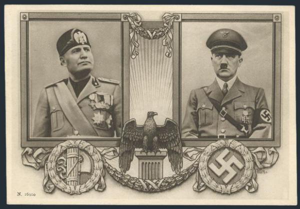by Florence 9 May 1938 slogan cancel for the VISIT OF ADOLF HITLER on b/w Propaganda postcard. Depicts HITLER & MUSSOLINI in uniform, nat'l crests & eagle. Addr to Germany. VF