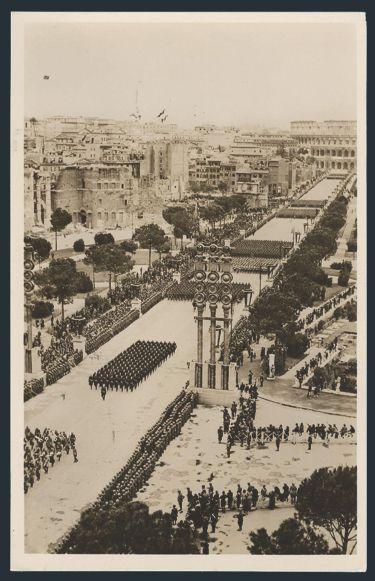 Tied by Rome 9 May 1938 slogan cancel for the VISIT OF ADOLF HITLER on b/w real photo Propaganda postcard. Depicts large Military Paradein Rome. Sent by airmail to Hamburg. VF