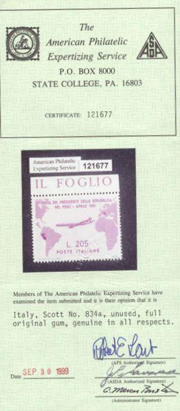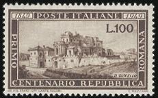 scarce example of the "BLUE CASTLE" variety having ALL COLOURS BUT THE ENGRAVED LIGHT BLUE OMITTED. Fresh, XF, NH. Has photocopy of 2004 Chiavarello Certificate for a multiple from which this stamp came. Bolaffi #1632B, Cat 2,650 Euro (Image) (View Certificate)