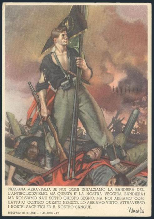 by Naples 24 Aug 1942 cancel on multi-colour illustrated WWII Propaganda postcard to Florence. Depicts a Fascist Black Shirt soldier holding Fascist flag, standing over fallen comrades. Has quote by Mussolini & his printed signature "We'll win