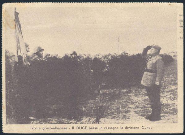 on WWII b/w Censored postcard used in 1942 depicting BENITO MUSSOLINI saluting soldiers of the CUNEO INFANTRY DIVISION. F, minor flaws (Image)