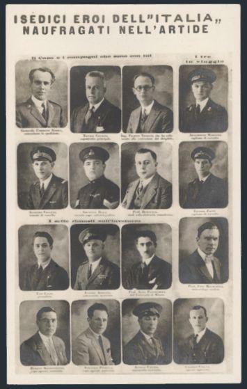 postcard from the 1920's depicting crew members of the DIRIGIBLE AIRSHIP "ITALIA" which attempted a North Pole flight. Depicts 16 diff portraits of the crew incl their commander GENERAL UMBERTO NOBILE. VF. Scarce early aviation postcard (Image)
