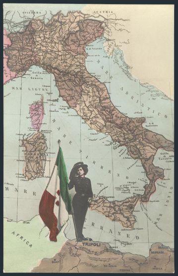 colour illustrated Patriotic postcard circa 1930's. Depicts Map of Italy & North Africa with woman in uniform holding Italian flag standing next to TRIPOLI on the map. VF