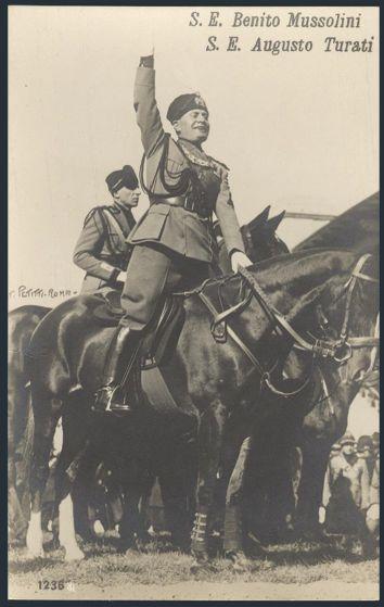 circa 1930's Fascist photo Propaganda postcard depicting BENITO MUSSOLINI saluting from horseback with Fascist politician Augusto Turati in background. VF (Image)