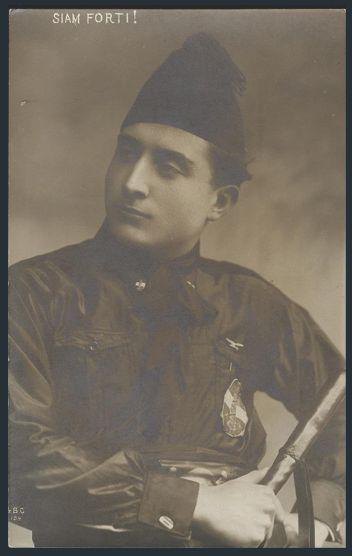 unused Patriotic photo postcards circa 1930's. Depicts 2 young FASCIST BLACK SHIRT PATRIOTS. One has skeleton image on his belt, the other has badge with Fasci symbol. Both have Air Force badges. Captions "Youth. Youth" & "We are Strong". VF (2