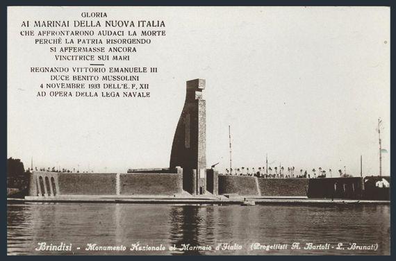 Patriotic b/w photo postcard depicting the Naval Monument at Brindisi on Inauguration Day "King Vittorio Emanuele III / Duce Benito Mussolini / 4 Nov 1933". VF