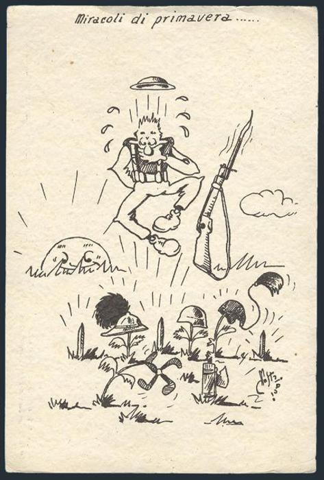 b/w illustrated comic ANTI-AXIS Patriotic postcard depicting surprised British soldier coming across graves of Axis soldiers. Caption reads "Miracle of Spring". Published by Propaganda Office of the armed forces. F (Image)