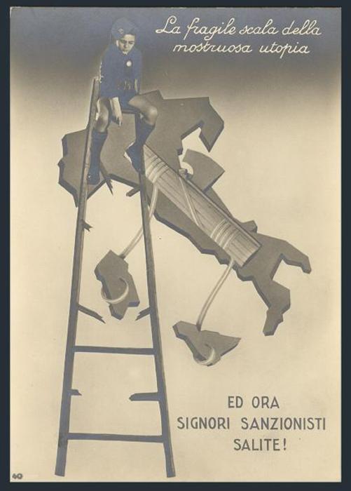 illustrated Fascist Propaganda postcard depicting young boy Patriot atop broken ladder superimposed over fasci & map of Italy. Caption "The fragile scale of the monstrous utopia / now gentlemen sanctions move up!". VF (Image)
