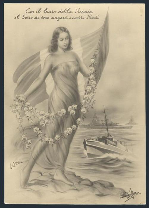 illustrated Fascist Propaganda postcard. Depicts female allegory holding Italian flag & wreath, with destroyers & torpedo boat in background. Caption "With the laurel of victory the wreath of roses will surround our brave men". VF (Image)