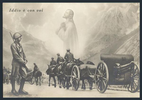 era illustrated Patriotic postcard depicting Italian mountain military unit with horse drawn cannons. Has Jesus praying in the background with caption "God is with you". VF