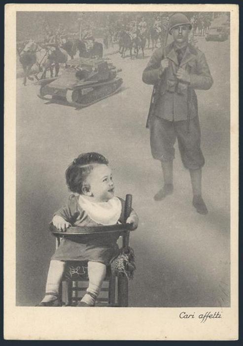 unused WWII b/w illustrated postcards depicting children & soldiers, tanks & warplanes. Interesting Fascist Propaganda items. VF (2) (Image)