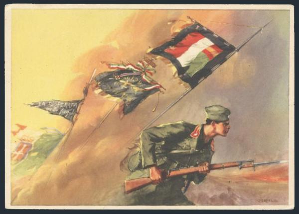 colour illustrated P.N.F. (Nat Fascist Party) Youth Branch Propaganda Postcard depicting young soldier in bayonette charge, flags & banners. Has quote from Mussolini with his printed signature. VF (Image)