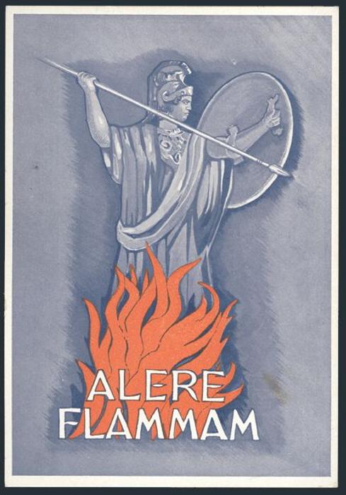 illustrated Fascist Conference, Rome Propaganda postcard 28 May 1939 depicting Victory effigy & flames. Motto "Nourish the Flame". Written message; no postal markings. VF