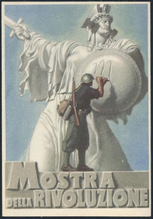colour illustrated Fascist Propaganda postcard celebrating 20th Anniversary of the Revolution; Exhibition Rome, 1942. Depicts soldier carving "M" in shield of effigy of Italia. VF. Considered very rare (Image)