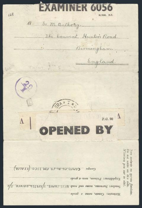 2809   imageStampless WWII POW official folded letter sheet from a British Prisoner in "CAMPO.P.G. No. 59". Addr to Birmingham. Interesting contents stating that he was in Bengasi. Has Br. & Italian censor tapes & h/s. F (Image) Estimate 50.00+ $Cdn