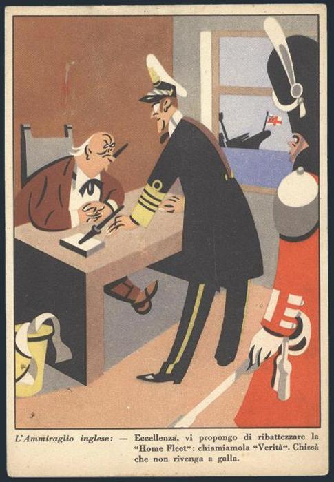 2813   imageUsed WWII colour illustrated Italian Forces Propaganda postcard depicting caricature of Royal Navy officer confronting WINSTON CHURCHILL, with sinking ship in the background. Caption "I suggest you rename the home fleet. Truly, who knows, it may come back to the surface". Scarce ANTI-BRITISH item. VF (Image) Estimate 100.00+ $Cdn