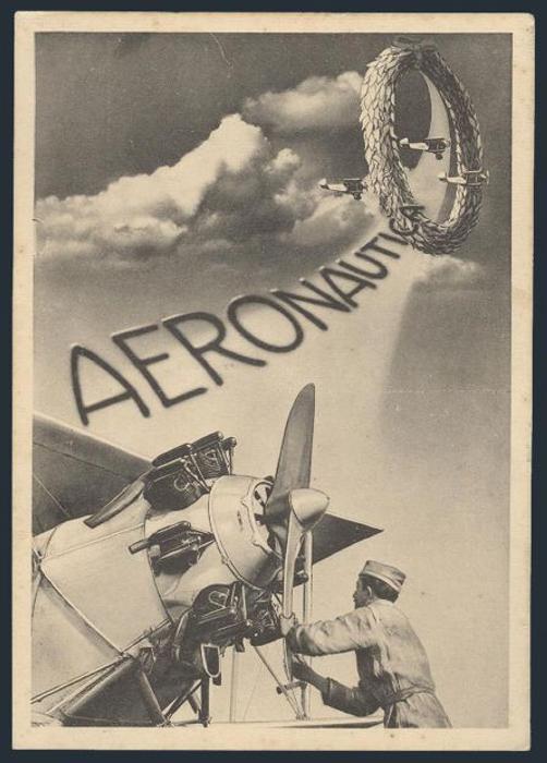 2801   imageUnused illustrated Fascist Propaganda postcard from 1941. Depicts serviceman rotating propeller on plane & plane flying through wreath, with "AERONAUTICA" imprint. F-VF (Image) Estimate 50.00+ $Cdn