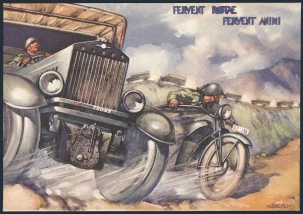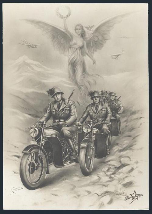 2802   imageUnused WWII illustrated Fascist Propaganda postcard from 1941. Depicts Motorcycle Brigade on the move with angel hovering over them. VF (Image) Estimate 65.00+ $Cdn