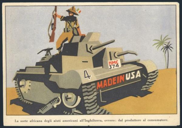 2811   imageUnused WWII colour illustrated Italian Forces ANTI-ALLIES Propaganda postcard. Depicts an Italian soldier atop a destroyed American tank in the desert. Caption reads "The fate of American aid to England. That's to say from the manufacturer to the consumer." VF (Image) Estimate 75.00+ $Cdn