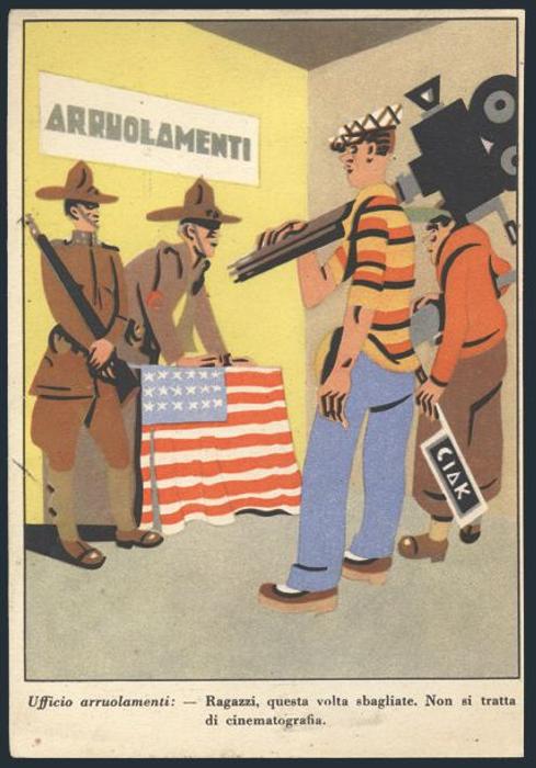2812   imageUsed WWII colour illustrated Italian Forces comic ANTI-AMERICAN Propaganda postcard depicting film crew approaching US soldiers at an enlisting office. Caption "Guys, this time you're wrong. It's not about cinematography." VF (Image) Estimate 75.00+ $Cdn
