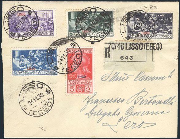 2817 LISSO 12-16 imageLISSO 12-16, Complete Ferrucci set neatly tied by Lisso 24 Nov, 1930 CDS's on Reg'd cover to Lero. VF. Cat $140 US (Image) Estimate 85.00+ $Cdn