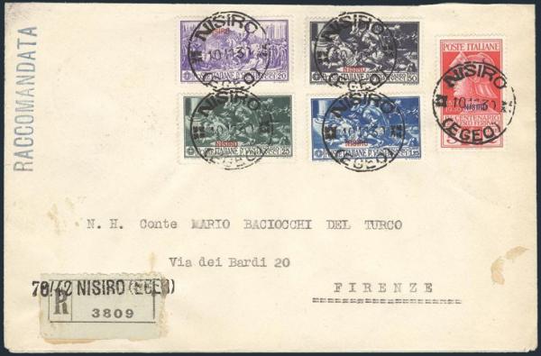 2818 NISIRO 12-16 imageNISIRO 12-16, Complete Ferrucci set neatly tied by Nisiro 10 Nov, 1930 CDS's on Reg'd cover addr to COUNT DEL TURCO in Florence. F. Cat $140 US (Image) Estimate 100.00+ $Cdn