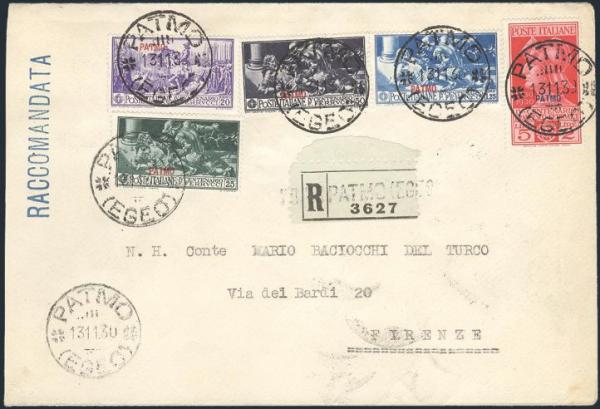 2819 PATMO 12-16 imagePATMO 12-16, Complete Ferrucci set neatly tied by Patmo 13 Nov, 1930 CDS's on Reg'd cover addr to COUNT DEL TURCO in Florence. F. Cat $140 US (Image) Estimate 100.00+ $Cdn
