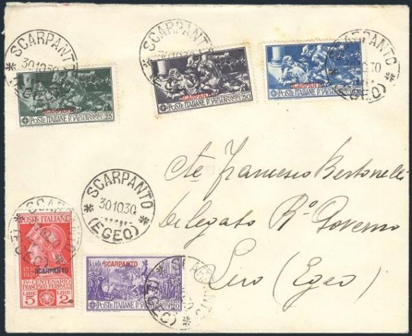 2820 SCARPANTO 12-16 imageSCARPANTO 12-16, Complete Ferrucci set neatly tied by Scarpanto 30 Oct, 1930 CDS's on cover to Lero. VF. Cat $140 US (Image) Estimate 85.00+ $Cdn