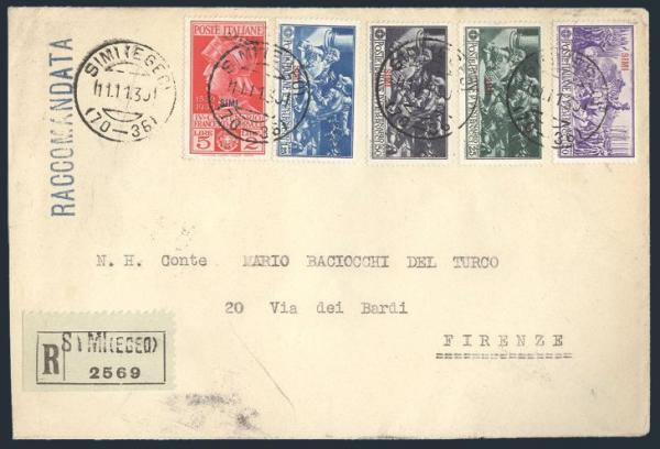 2821 SIMI 12-16 imageSIMI 12-16, Complete Ferrucci set neatly tied by Simi 11 Nov, 1930 CDS's on Reg'd cover addr to COUNT DEL TURCO in Florence. F. Cat $140 US (Image) Estimate 100.00+ $Cdn