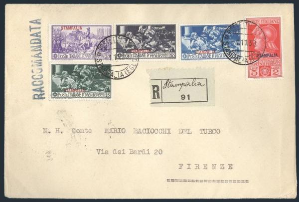 2822 STAMPALIA 12-16 imageSTAMPALIA 12-16, Complete Ferrucci set neatly tied by Stampalia 1 Nov, 1930 CDS's on Reg'd cover addr to COUNT DEL TURCO in Florence. F. Cat $140 US (Image) Estimate 100.00+ $Cdn