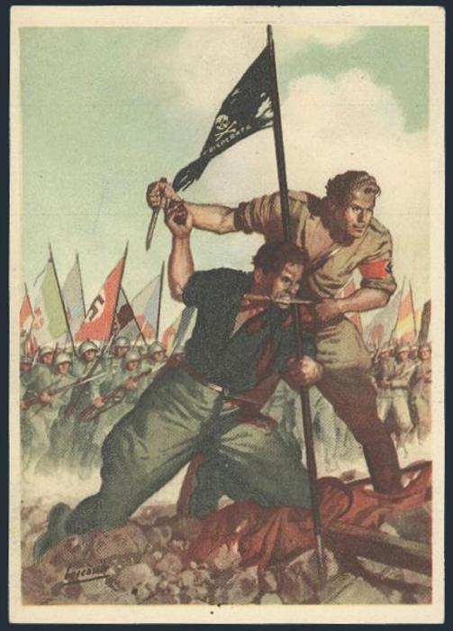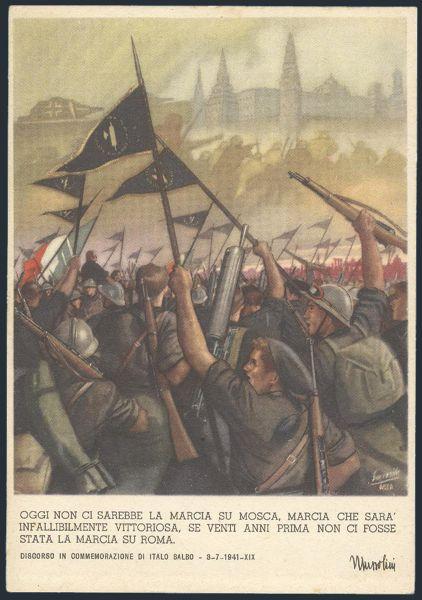 2805   imageUnused multi-colour illustrated Anti-Bolshevik WWII Propaganda postcard depicting Italian Black Shirt soldiers holding Fascist banners on the attack with German Forces (tank in the distance) at Moscow. Has quote from Mussolini & his printed signature "There would not be a march on Moscow without the march on Rome". VF (Image) Estimate 65.00+ $Cdn