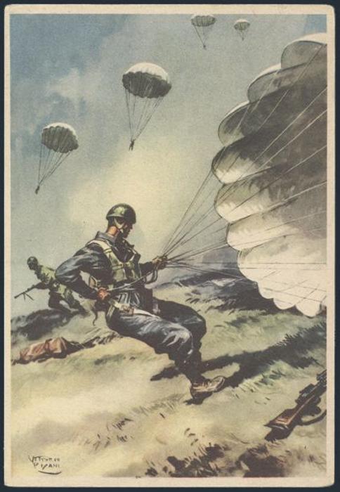 2803   imageUnused WWII colour illustrated Fascist Propaganda field postcard depicting parachutists landing on battlefield; artist signed. VF (Image) Estimate 50.00+ $Cdn