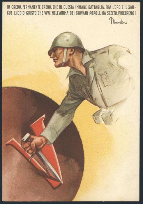 2806   imageUnused WWII colour illustrated Nat. Dante Alighieri Soc. Fascist Propaganda postcard depicting globe, "V" for victory & Italian soldier holding a large dagger. Has quote by Mussolini with his printed signature. VF (Image) Estimate 75.00+ $Cdn