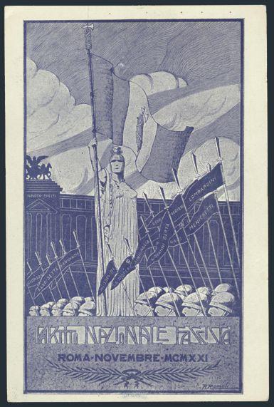 2804   imageUnused WWII blue illustrated P.N.F. (Nat Fascist Party) Propaganda postcard depicting Victory allegory, flag & soldiers holding banners with various party leaders' names incl Mussolini. Considered very rare. VF (Image) Estimate 100.00+ $Cdn