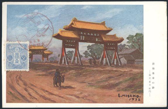 2850 129b image129b, Tied by fancy red airplane cancel on coloured postcard for the 1934 Air Service Inauguration from OSKAKA TO PEKING CHINA. VF (Image) Estimate 65.00+ $Cdn