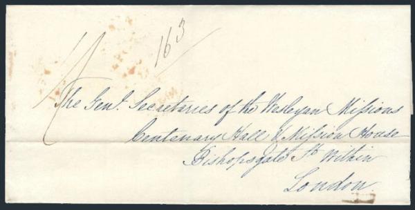 2830   imageStampless folded cover from Kingston Jamaica 29 Jan, 1841 to the Wesleyan Missions in London, England (rec b/s). F (Image) Estimate 100.00+ $Cdn