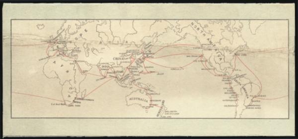 N.Y.K. Line colour illustrated letter card/menu from aboard Passenger ship "TATSUTA MARU" 28 Oct 1931. Beautiful image of vintage sailing ship on inside and world map showing routes on back. The ship served as a WWII troop carrier, thence a