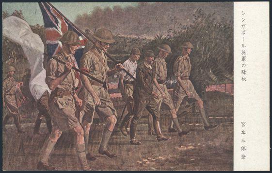 multi-coloured 2s postal stat card. Depicts the SURRENDER OF THE BRITISH GARRISON AT SINGAPORE in Feb 1942. VF (Image)
