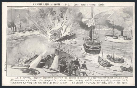 postcard depicting a 1904 naval action scene from the RUSSO-JAPANESE WAR. Depicts the loss of the Russian ships 'VARYAG' & 'KORIETZ' at Chemulpo Bay. VF (Image)