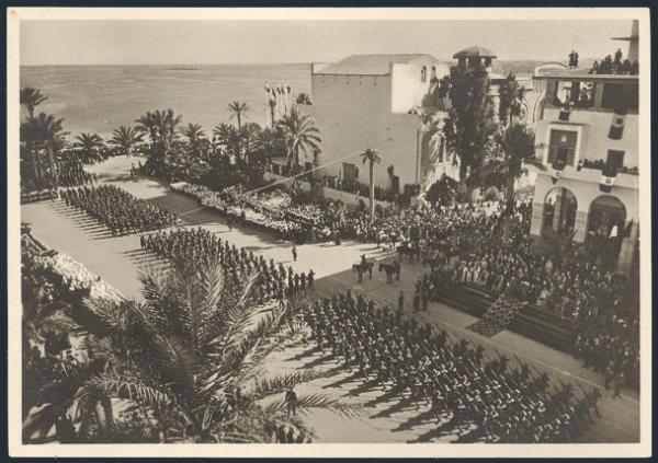 2950   imageUnused Patriotic photo postcard depicting Italian infantry marching past the Papal Legate & retinue during the Eucharistic Congress at Tripoli, Libya in 1937. VF (Image) Estimate 45.00+ $Cdn