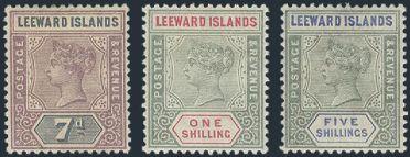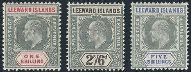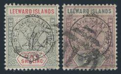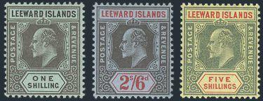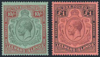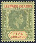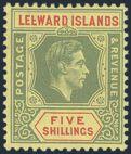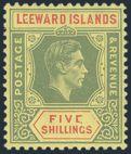 2934 113 image113, KGVI Five Shilling from the 1938 Printing with the very scarce BROKEN "E" in "LEEWARD" variety. Pristine fresh colours, F-VF, VLH (SG #112a, Cat £1,600) (Image) Estimate 900.00+ $Cdn