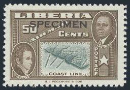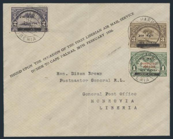 2944 C1-3 imageC1-3, Scarce first Airmail set neatly tied by Harper, Liberia 28 Feb 1936 CDS's on cover. Has 2-line h/s "ISSUED UPON THE OCCASION OF THE FIRST LIBERIAN AIR MAIL SERVICE DUSIDE TO CAPE PALMAS 28 Feb, 1936." VF, centre fold not affecting stamps. A RARE COVER (Image) Estimate 1,000.00+ $Cdn